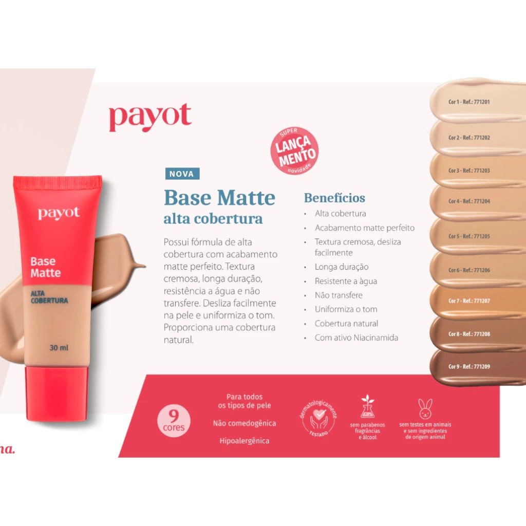 A Base Matte Payot oferece alta cobertura com um acabamento matte impecável.
