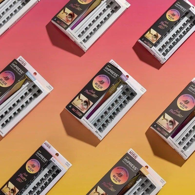 O imPRESS Press-on Falsies é a primeira linha de cílios postiços autocolantes do mercado, dispensando cola, tempo de secagem e evitando danos aos cílios naturais.