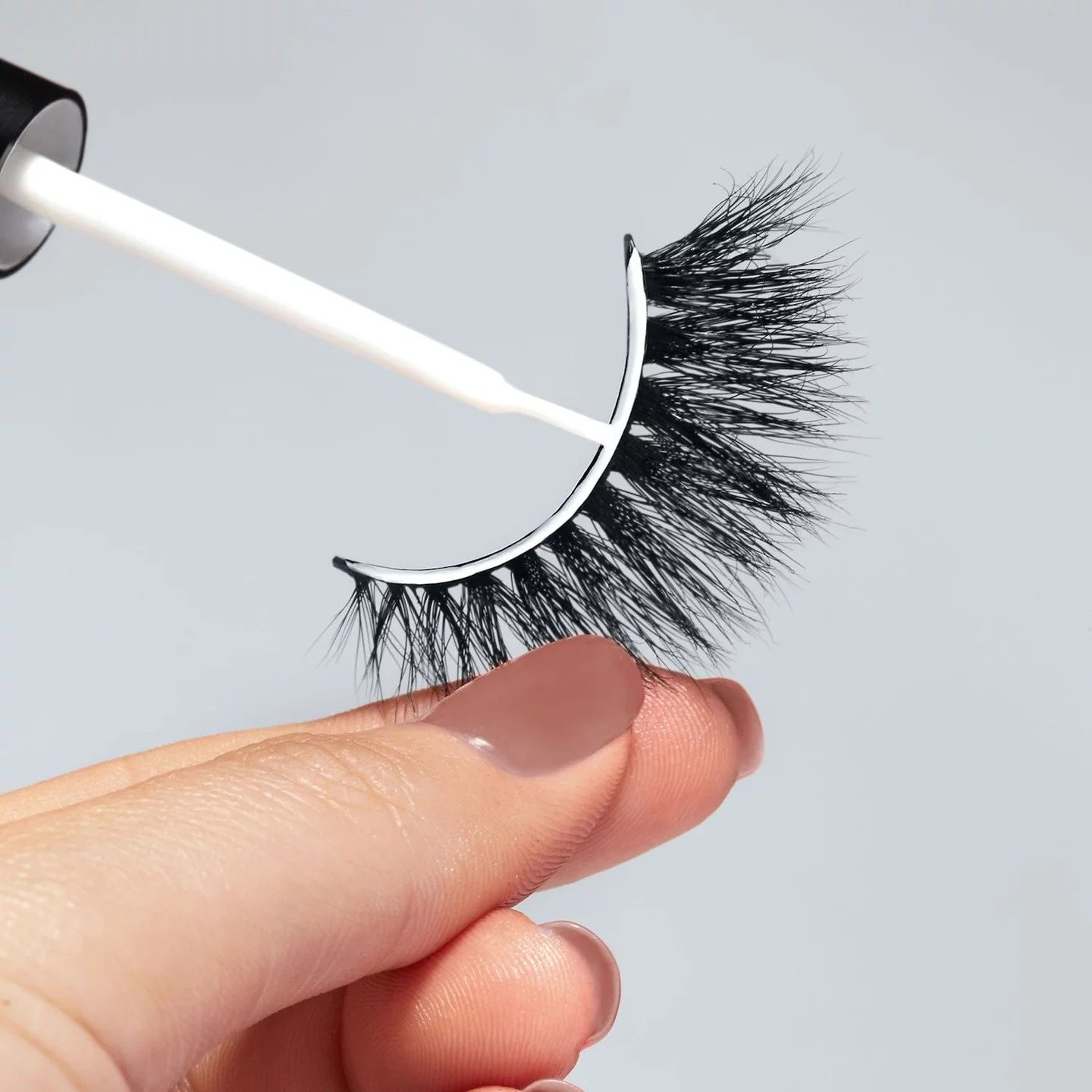 Aplique uma fina camada da cola na base dos cílios postiços, espere de 30 a 60 segundos até que a cola fique levemente pegajosa, e posicione os cílios sobre a linha natural dos seus. Pressione suavemente para fixar.
