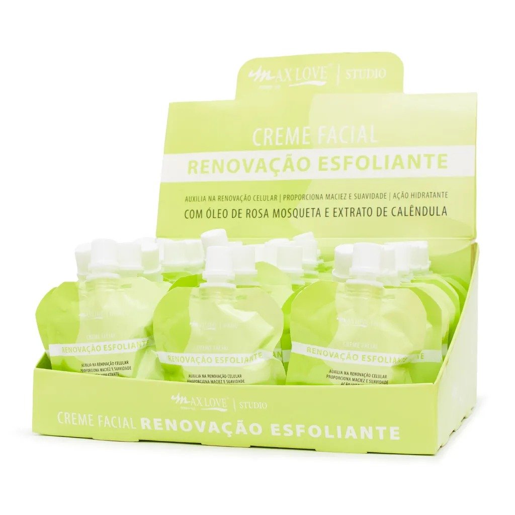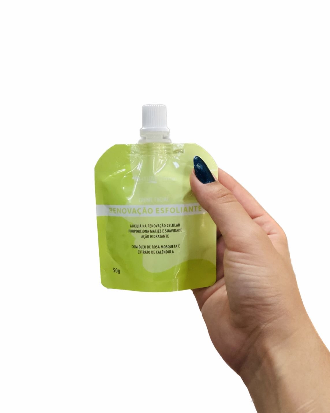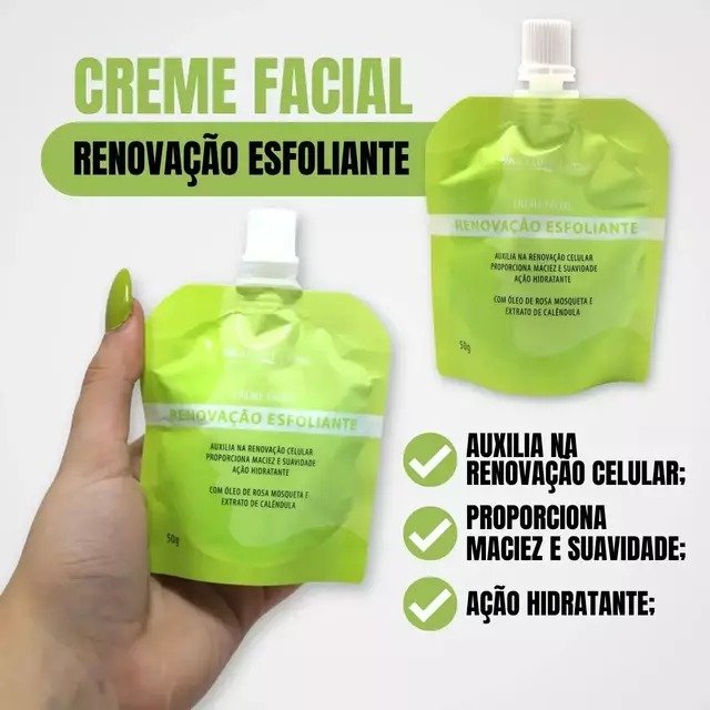 O Creme esfoliante Renovação 50g auxilia na remoção de células mortas.