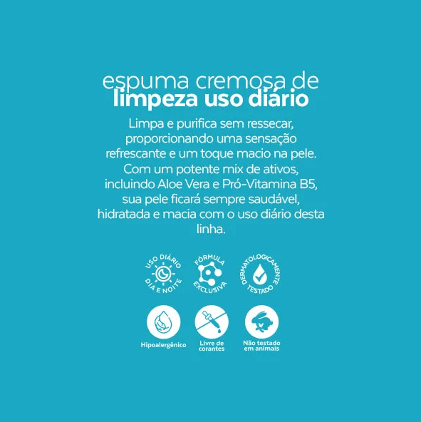 Sua fórmula é enriquecida com Aloe Vera, que acalma e hidrata, e Pró-Vitamina B5, que melhora a textura da pele. Ideal para quem busca uma rotina de cuidados que deixe a pele saudável, protegida e revitalizada ao longo do dia.