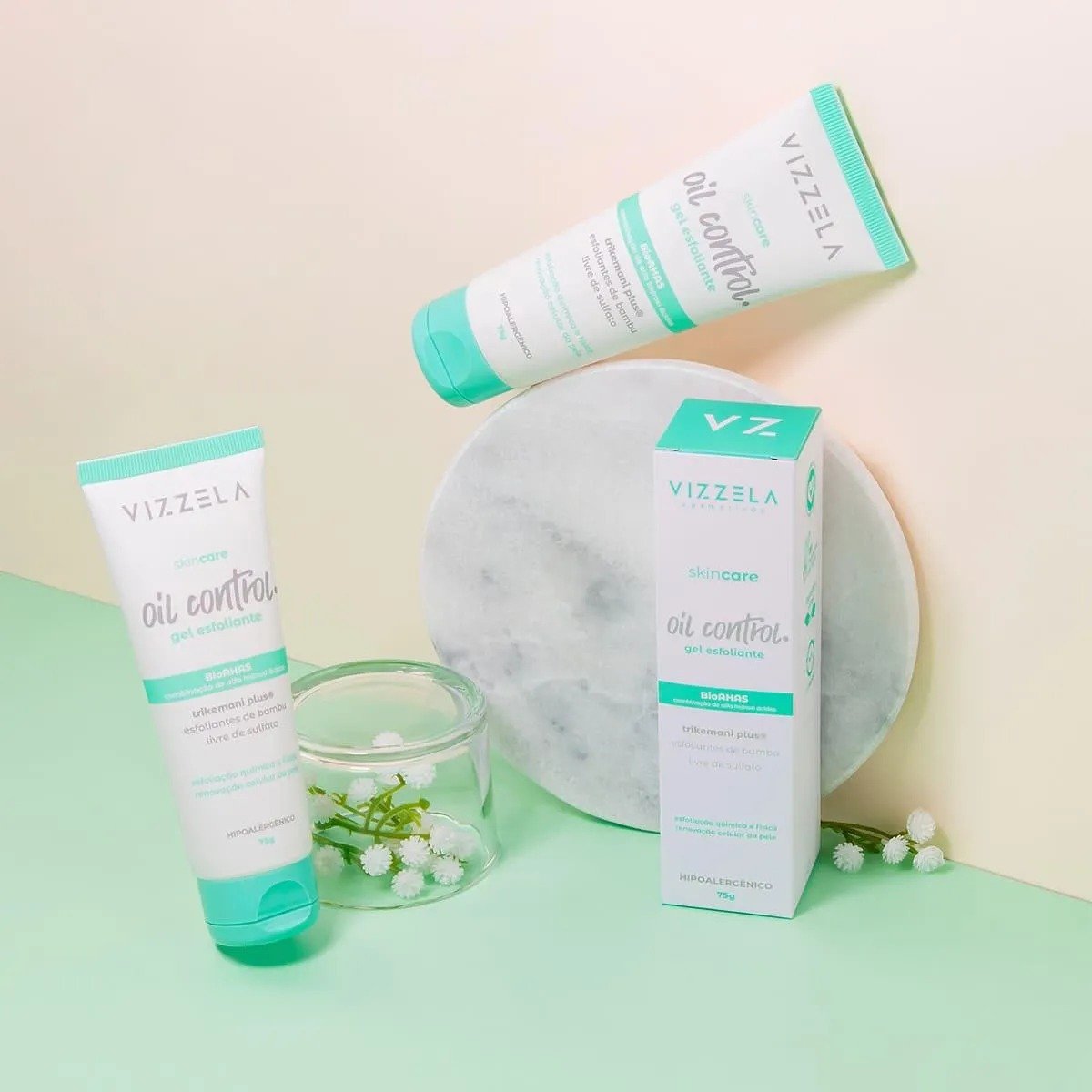 O Gel Esfoliante Oil Control Vizzela promove uma esfoliação física e química, removendo células mortas, desobstruindo os poros e equilibrando a flora cutânea. Sua fórmula combina BioAHAs, que são alfa-hidroxiácidos naturais, com esfoliantes de bambu, proporcionando uma renovação celular eficaz e mantendo a pele saudável. Conta ainda com Trikemani Plus®, um complexo prebiótico que ajuda a manter o equilíbrio da pele.