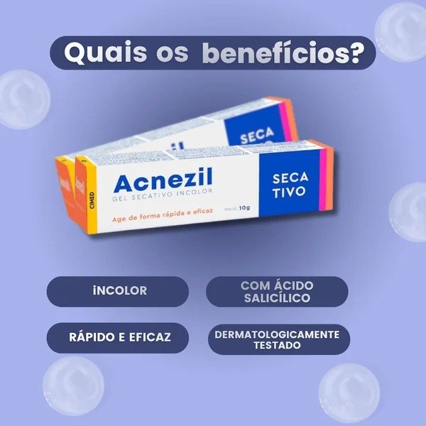 O Gel Secativo Incolor Acnezil foi desenvolvido especialmente para auxiliar no tratamento de peles acneicas, ajudando a reduzir a vermelhidão e a inflamação de espinhas de forma rápida e eficaz.