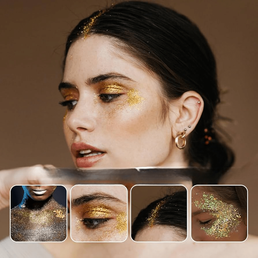Ideal para o Carnaval, festas, maquiagens artísticas ou até para decoração de roupas e acessórios, o glitter pode ser usado no rosto, corpo e cabelos.