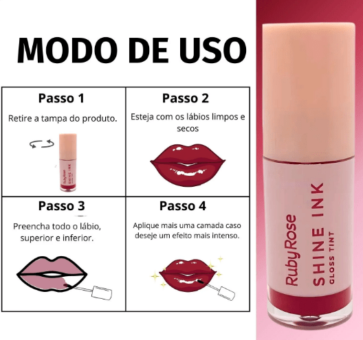 O Gloss Tint Ruby Rose Shine Ink é a escolha perfeita para quem busca lábios impactantes com alta pigmentação e brilho intenso. Com acabamento gloss e efeito tint, ele tinge os lábios de forma duradoura: mesmo após a remoção da camada brilhosa, a cor permanece, garantindo um visual bonito por muito mais tempo.