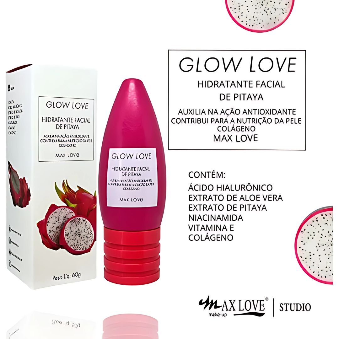 O Hidratante Facial Vegano Max Love Glow Love Pitaya, auxilia na ação antioxidante, contribui para a nutrição da pele, enriquecido com cólageno.