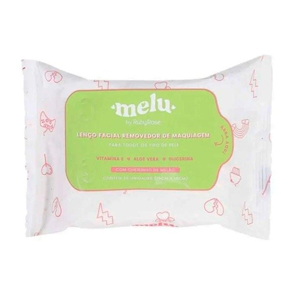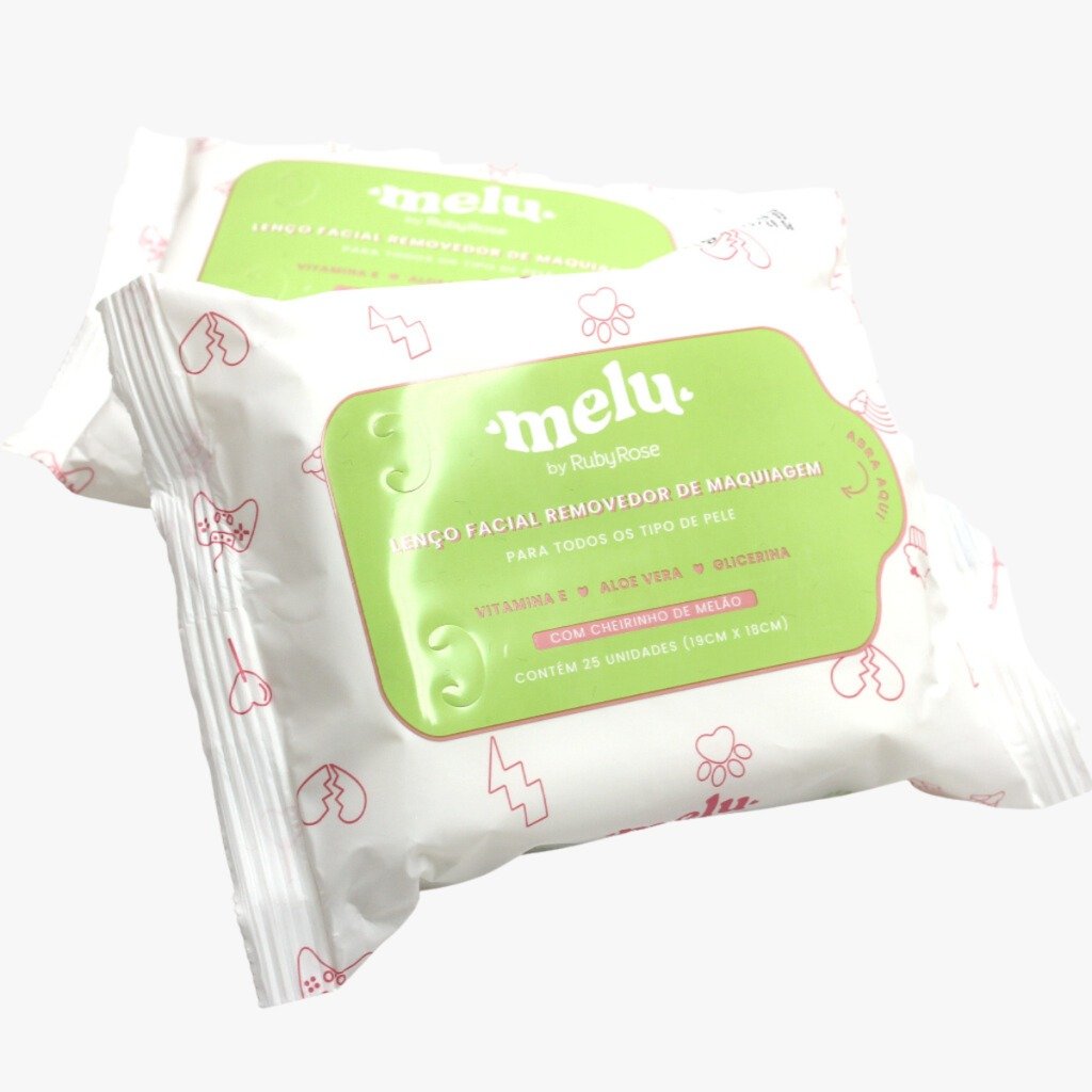 O lenço demaquilante da Melu contém 25 unidades de 9 cm x 18 cm cada uma e foi especialmente desenvolvido para facilitar a remoção de toda a maquiagem do rosto.