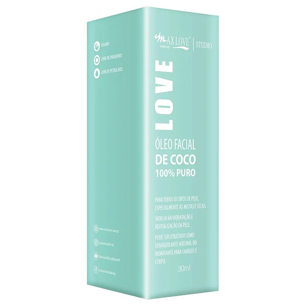 O Óleo Facial de Coco 100% Puro Max Love com 30 ml é perfeito para revitalizar e hidratar tanto a pele do rosto quanto do corpo.