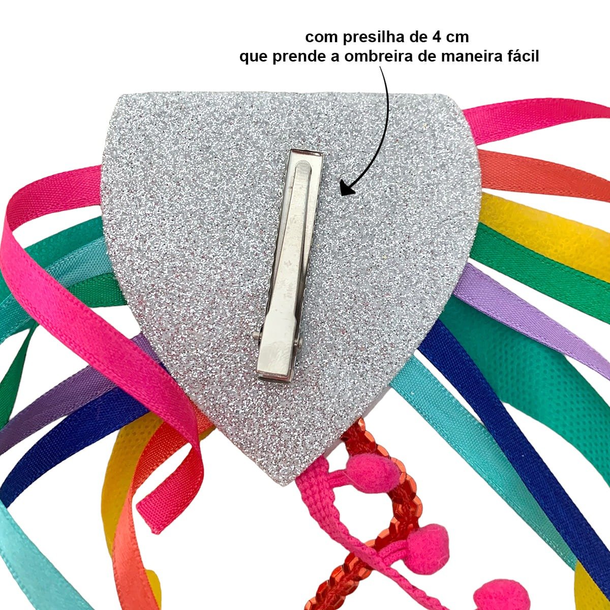• Ombreira com Fios de Cetim: A ombreira é composta por múltiplos fios de cetim, proporcionando um visual vibrante e impactante, ideal para completar seu look carnavalesco com muito estilo.