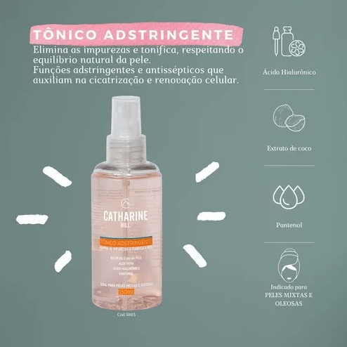 O Tônico Adstringente da marca brasileira Catharine Hill é especialmente desenvolvido para peles mistas e oleosas.