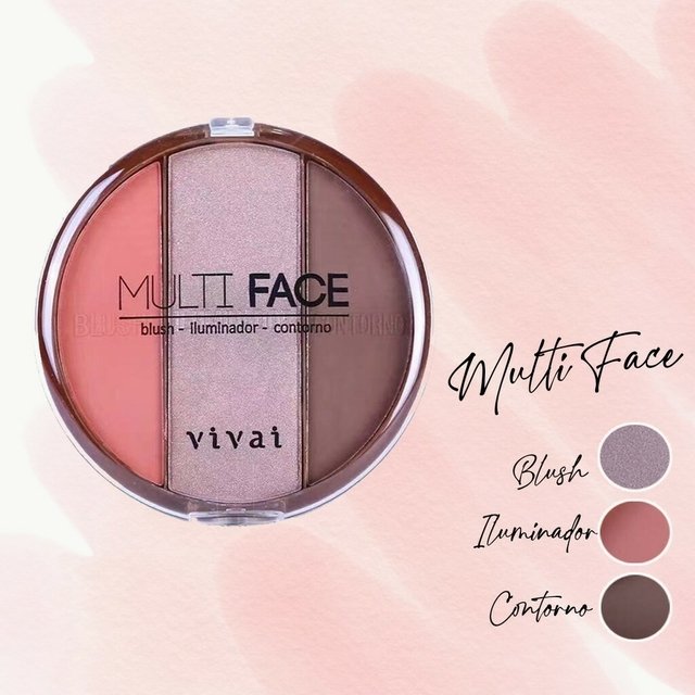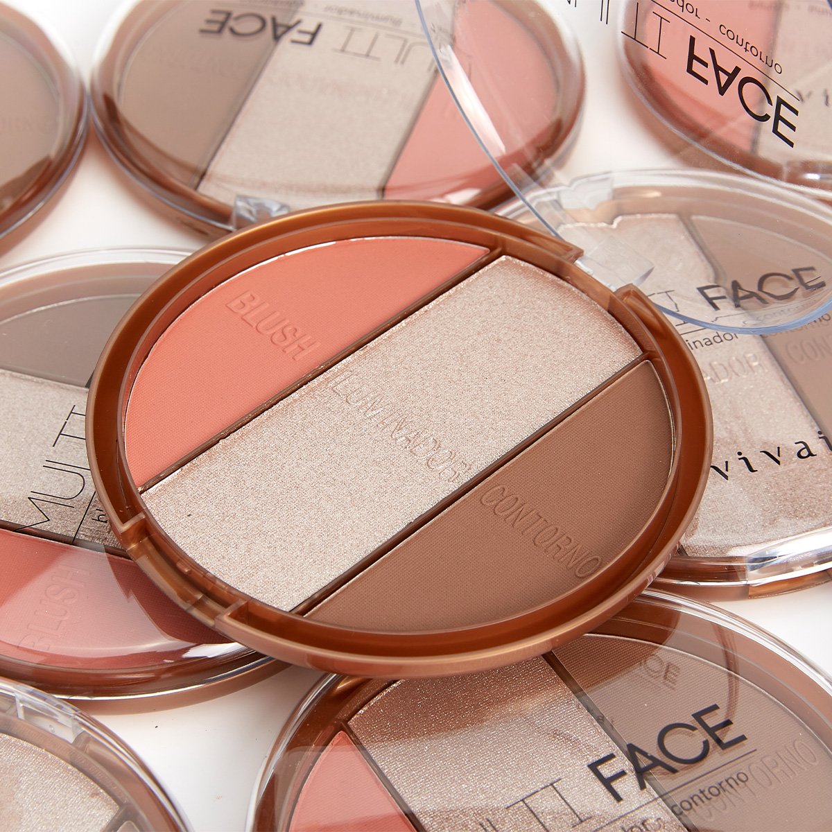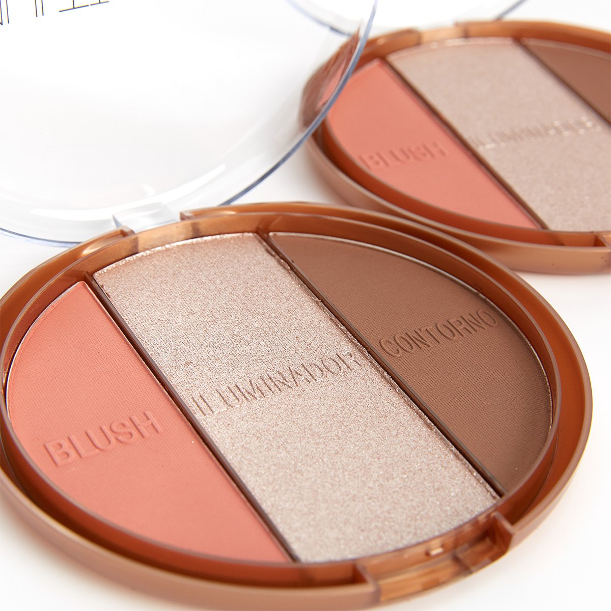 O produto ideal para quem busca praticidade e qualidade, para deixar sua maquiagem impecável, ela reune três essenciais produtos de maquiagem em uma única embalagem, contorno, blush e iluminador.